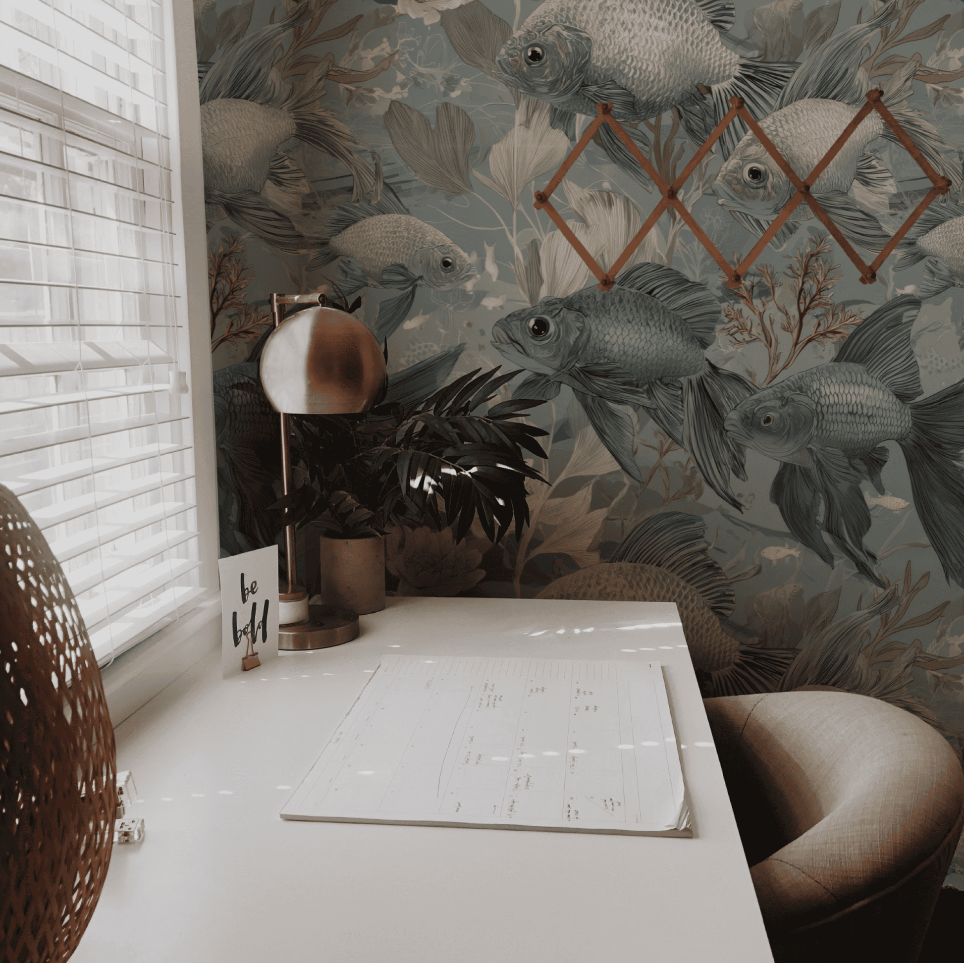 Immerse yourself in a serene underwater world with graceful fish and delicate aquatic plants, evoking tranquility and harmony.