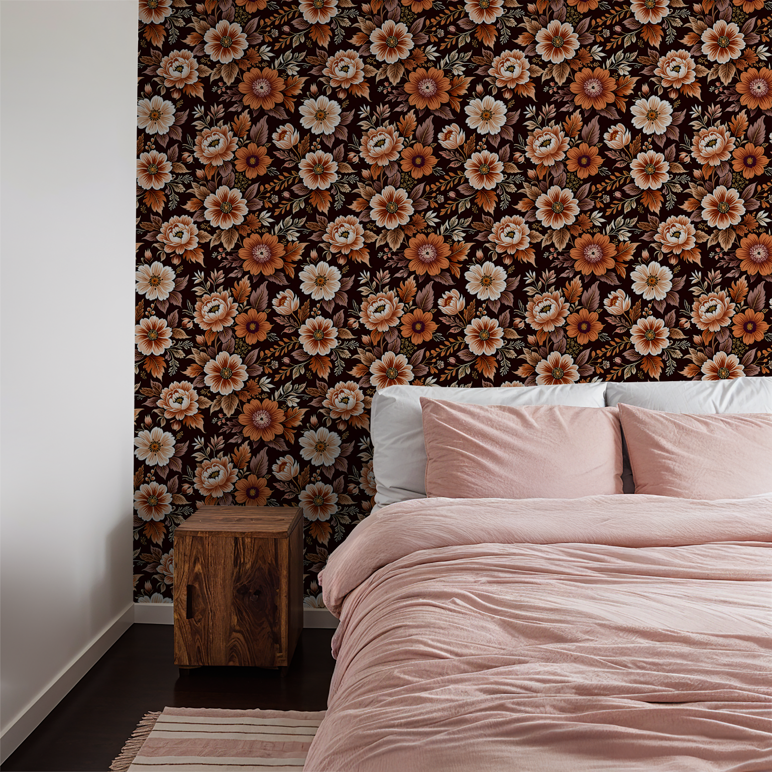 The Baroque Floral Amber Wallpaper captivates with an intricate floral motif set against a richly dark background. The design features detailed blooms and leaves that exude an ornate and luxurious baroque style, with a warm palette of reds, oranges, and browns dominating the visual experience.