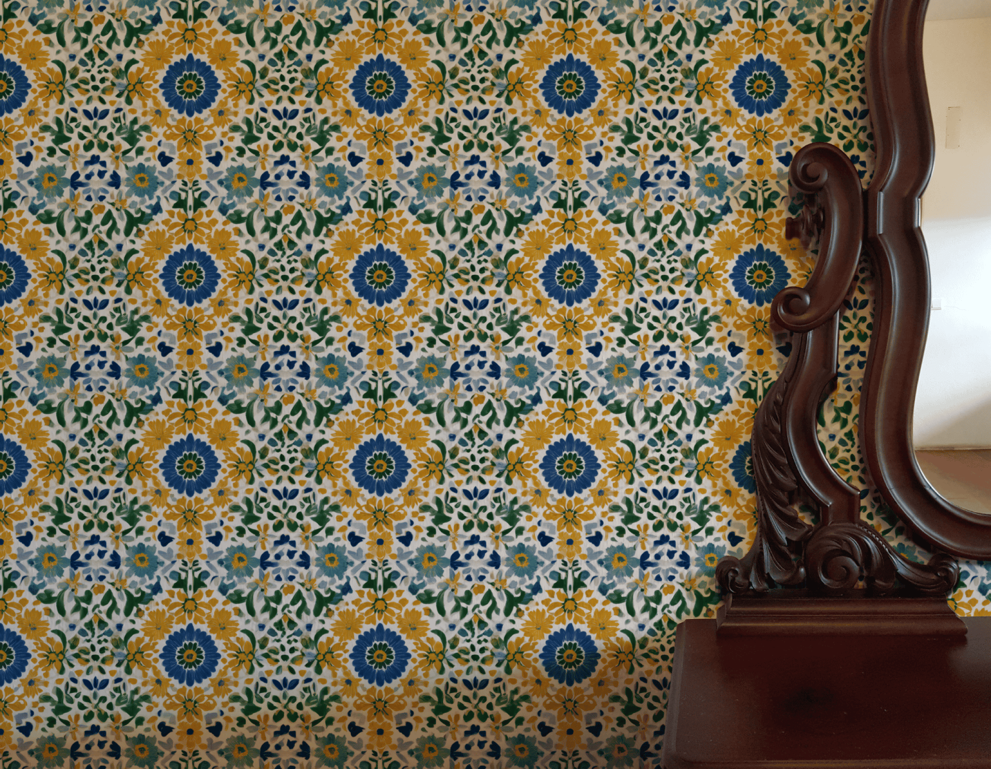 This vibrant design features a harmonious blend of golden yellows, deep blues, and lush greens, creating an enchanting floral mosaic. The intricate patterns evoke a sense of joyful springtime, perfect for adding a touch of elegance and vitality to any space.