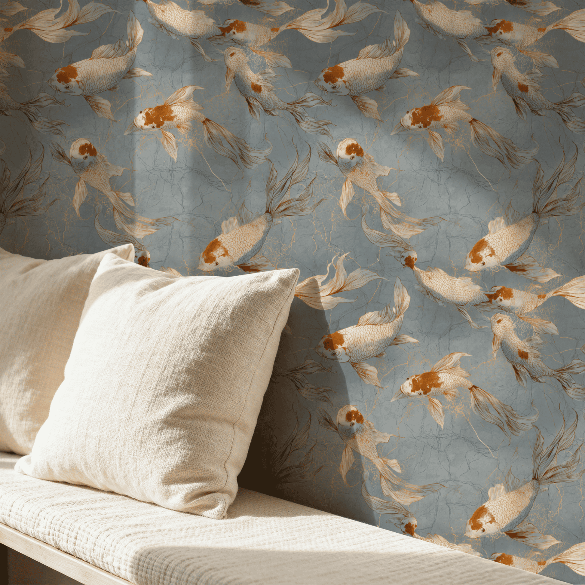 This stunning wallpaper features gracefully swimming koi fish in a rich palette of gold and soft blue. The intricate detailing of the fish, accompanied by flowing fins, creates a serene aquatic scene, evoking a sense of tranquility and elegance.