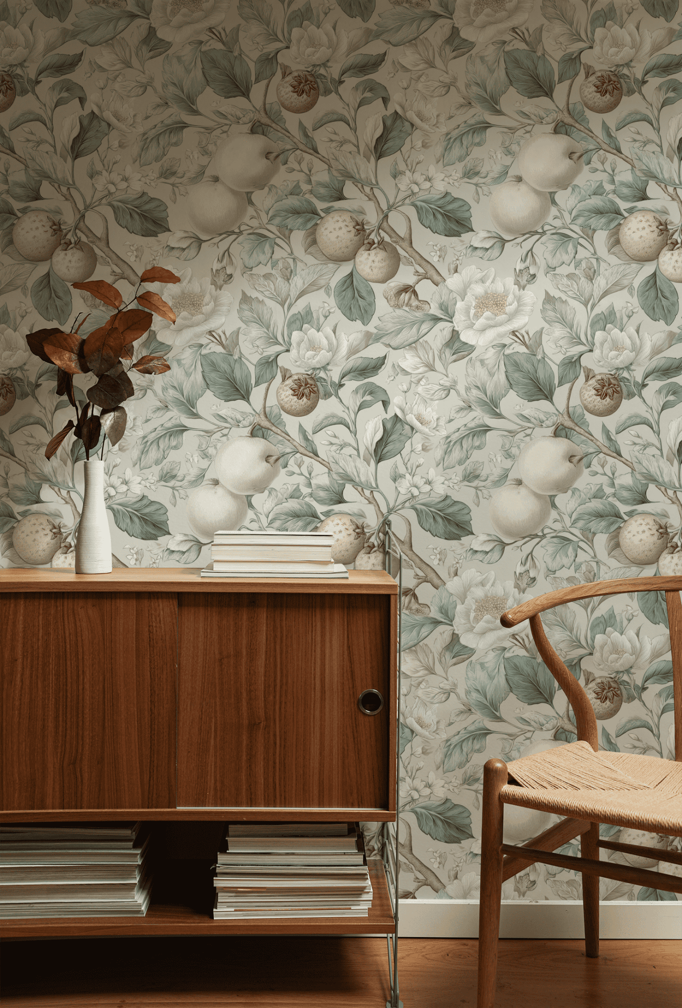 This enchanting wallpaper features a delicate botanical design, showcasing a harmonious blend of soft, muted colors with intricate illustrations of apples and pomegranates among lush foliage. The gentle incorporation of floral elements adds a touch of elegance, creating a serene and inviting atmosphere perfect for any space.