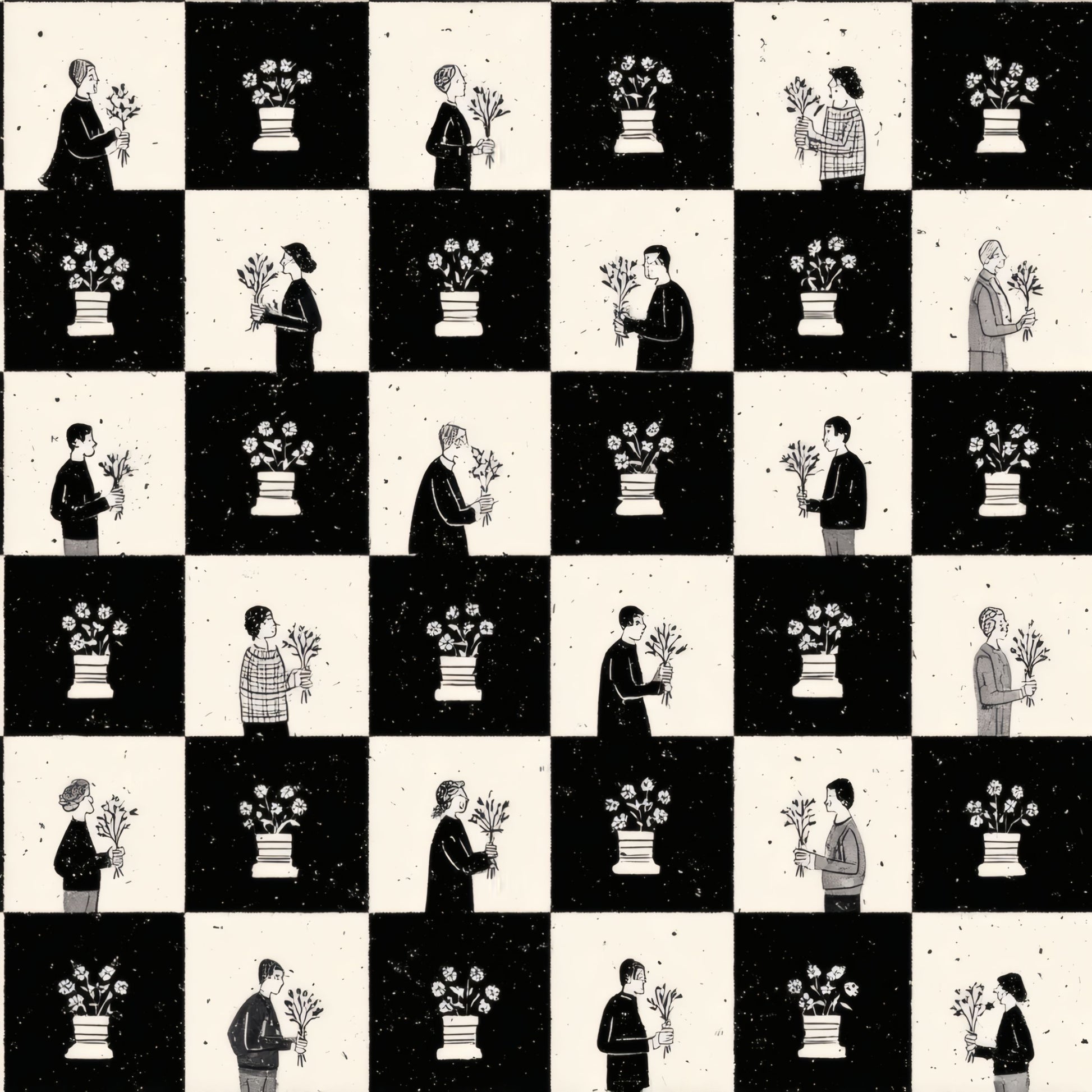 This wallpaper features a striking grid of monochromatic designs, showcasing individuals holding vases of flowers against a backdrop of bold black and cream squares. The repetitive motif creates a playful yet sophisticated atmosphere, blending modern illustration with a touch of vintage charm.