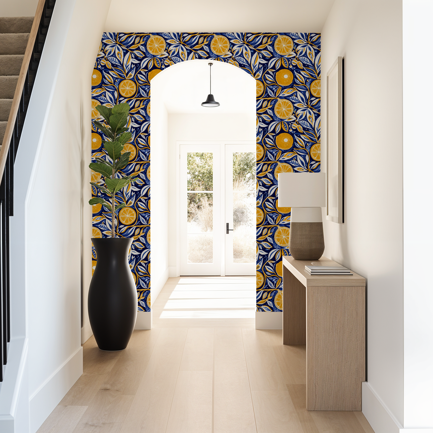 Introducing the Citrus Navy Retro Wallpaper, a vibrant addition to any space, featuring an eye-catching motif of stylized citrus fruits and leaves. The bold interplay of deep navy and lively shades of orange and yellow evokes a sense of timeless retro charm, reminiscent of mid-century design aesthetics. This color family and geometric pattern create a striking visual impact, perfect for those looking to make a statement.