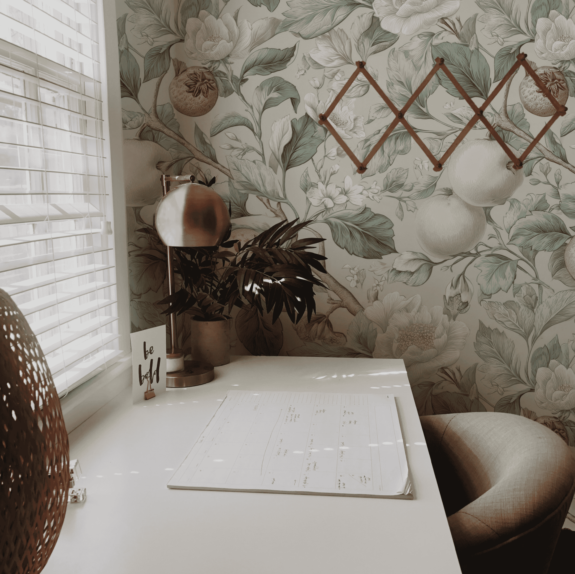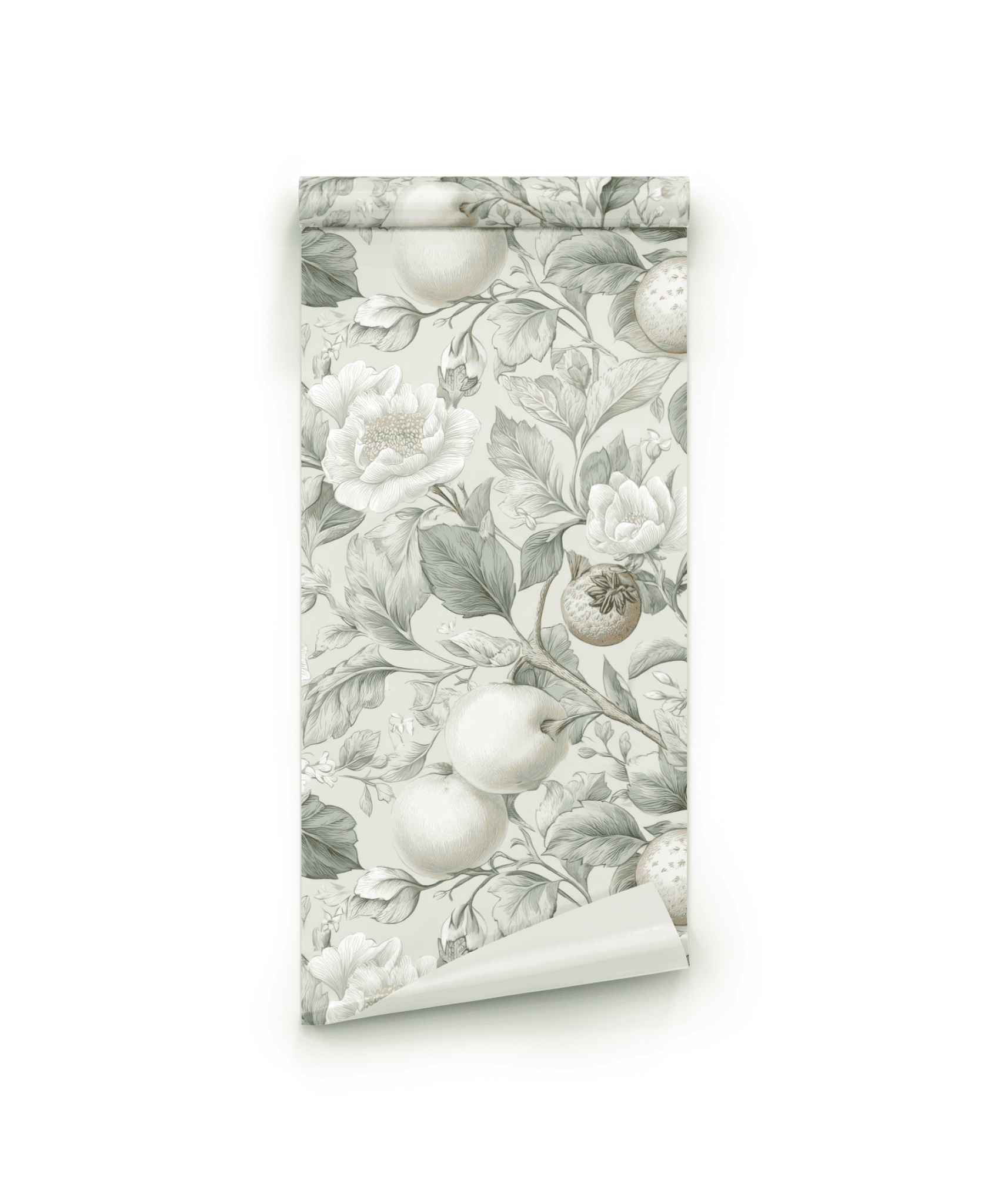 Embrace serene elegance with soft, intricate florals and muted natural tones, crafting a tranquil retreat.