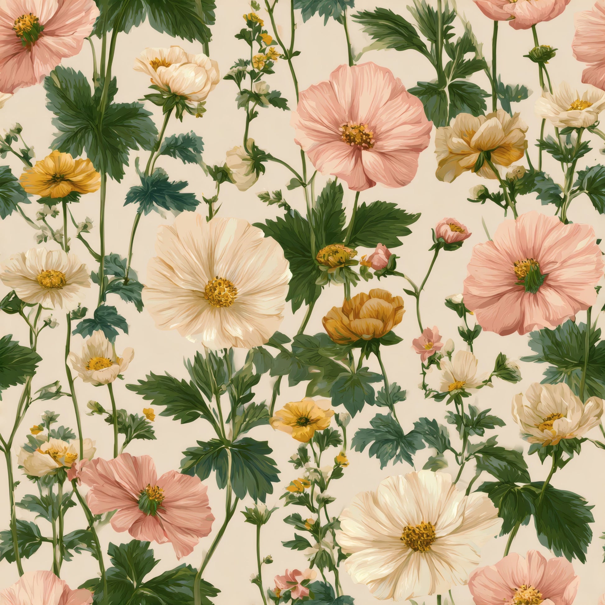 This enchanting wallpaper features a delightful arrangement of soft pastel blooms, showcasing delicate petals in shades of pink, cream, and yellow. The intricate floral motifs are complemented by lush green foliage, creating a serene garden ambiance that invites tranquility into any space.