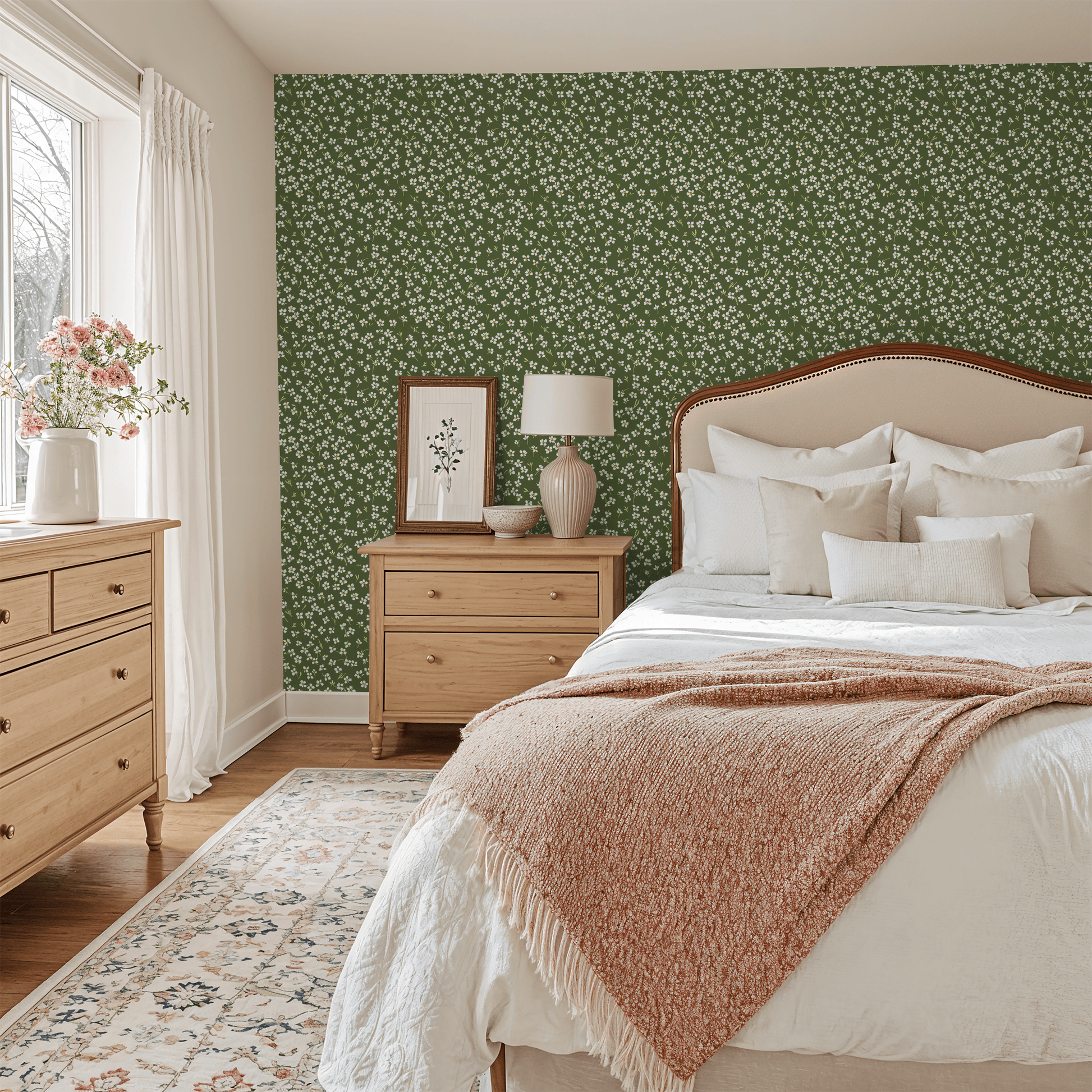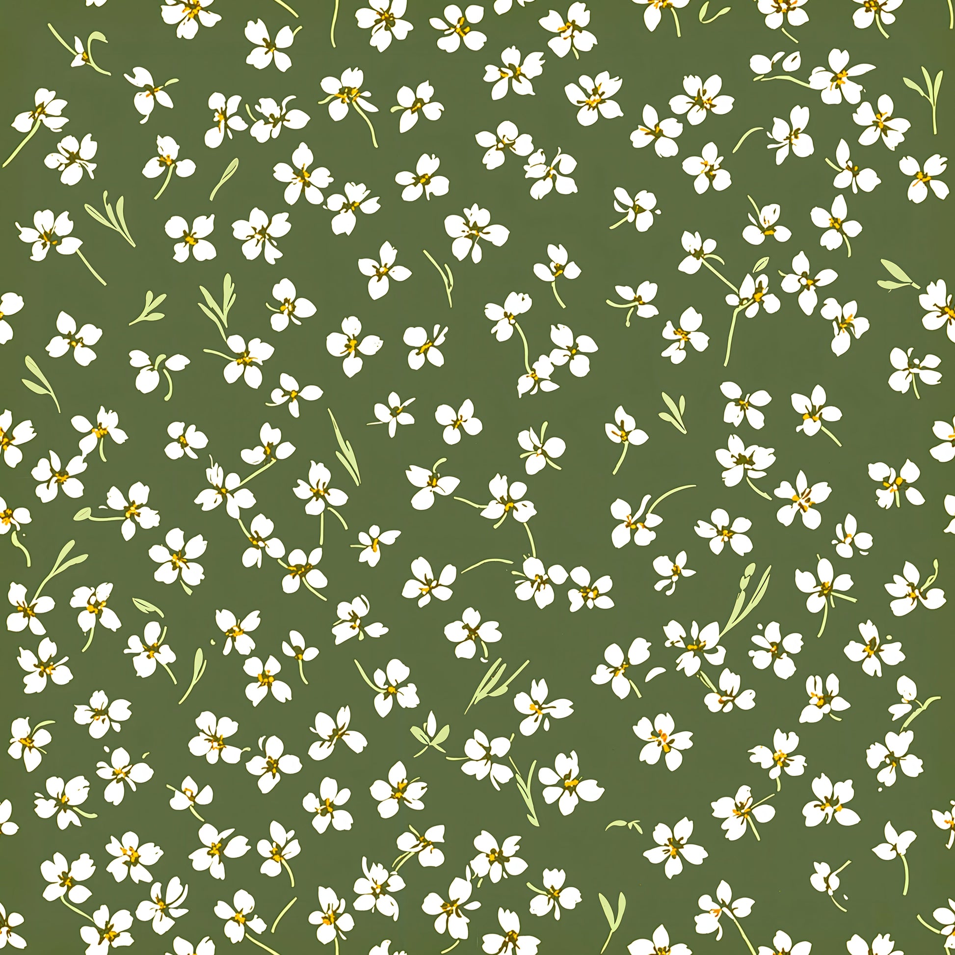Floral Noir Retro Wallpaper is a charming design that effortlessly combines vintage charm with a modern twist. The dominant motif of scattered delicate florals is set against a rich olive-green background, creating an alluring contrast that speaks of mid-century elegance. This wallpaper's primary color family of deep greens and soft whites echoes a nostalgic yet contemporary style, perfect for those seeking a touch of retro flair in their interiors.
