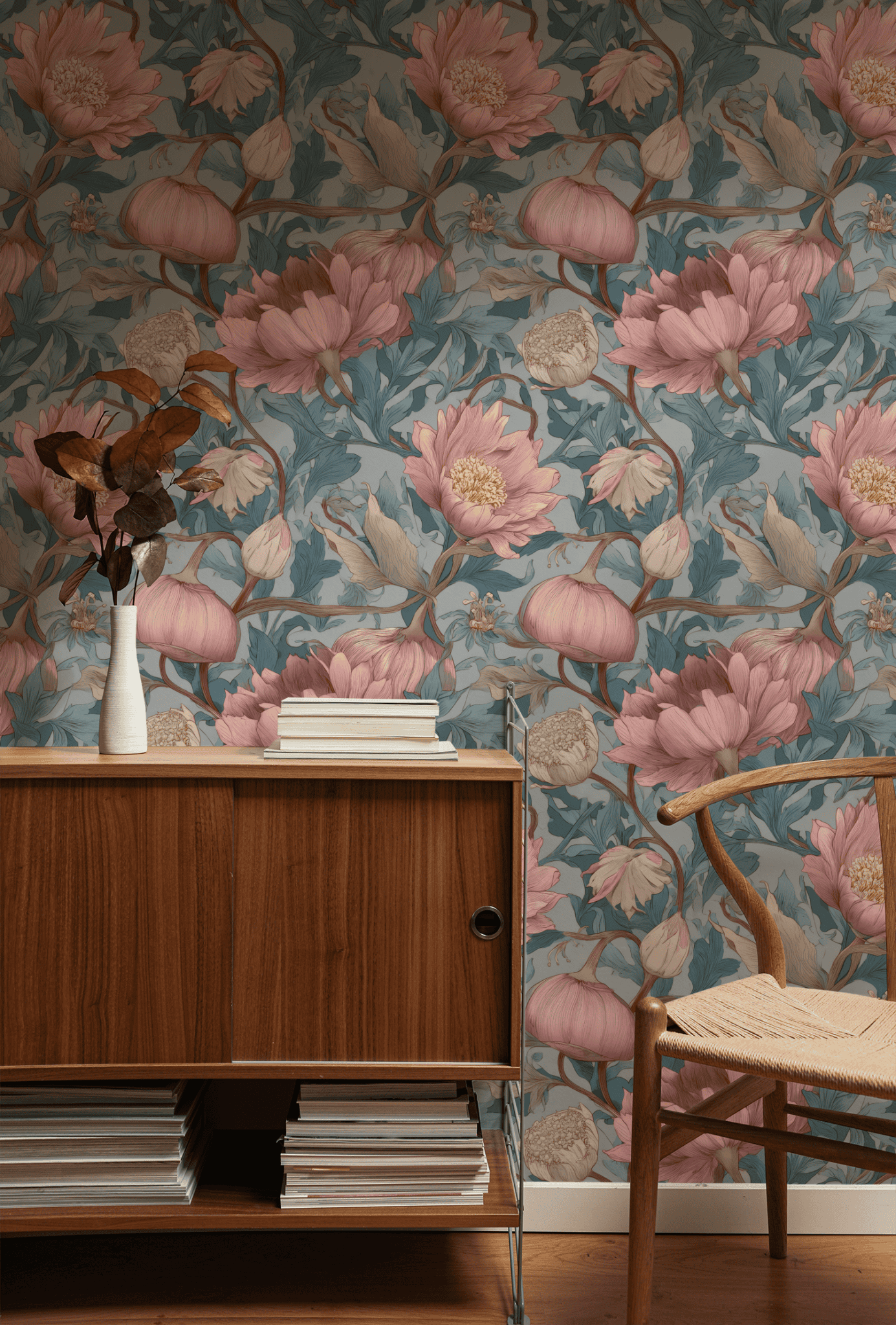 This enchanting wallpaper features a harmonious blend of soft pink and muted teal hues, showcasing intricately detailed floral motifs. The delicate blossoms and graceful leaves intertwine, creating a dreamy, botanical landscape that adds an air of elegance and serenity to any space.