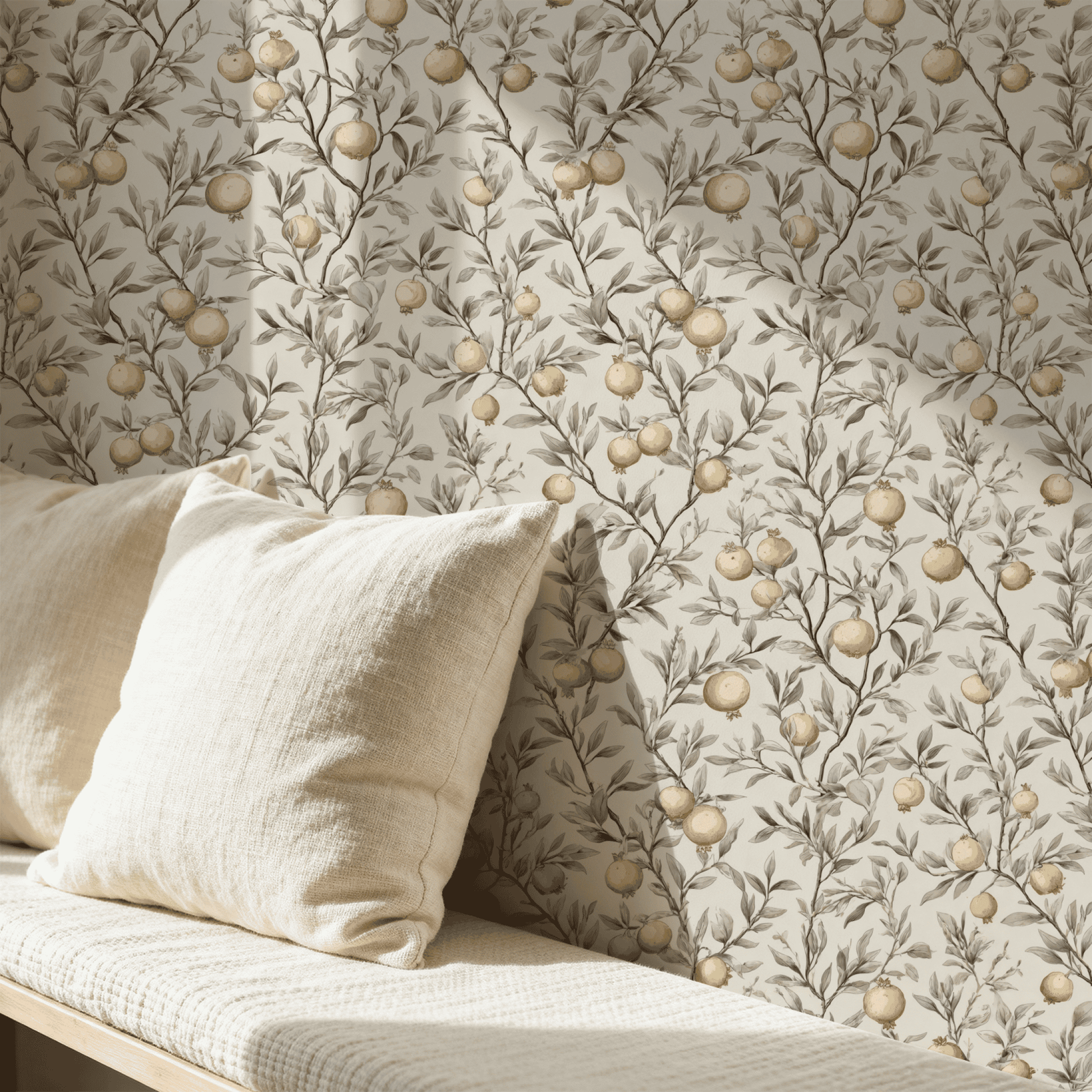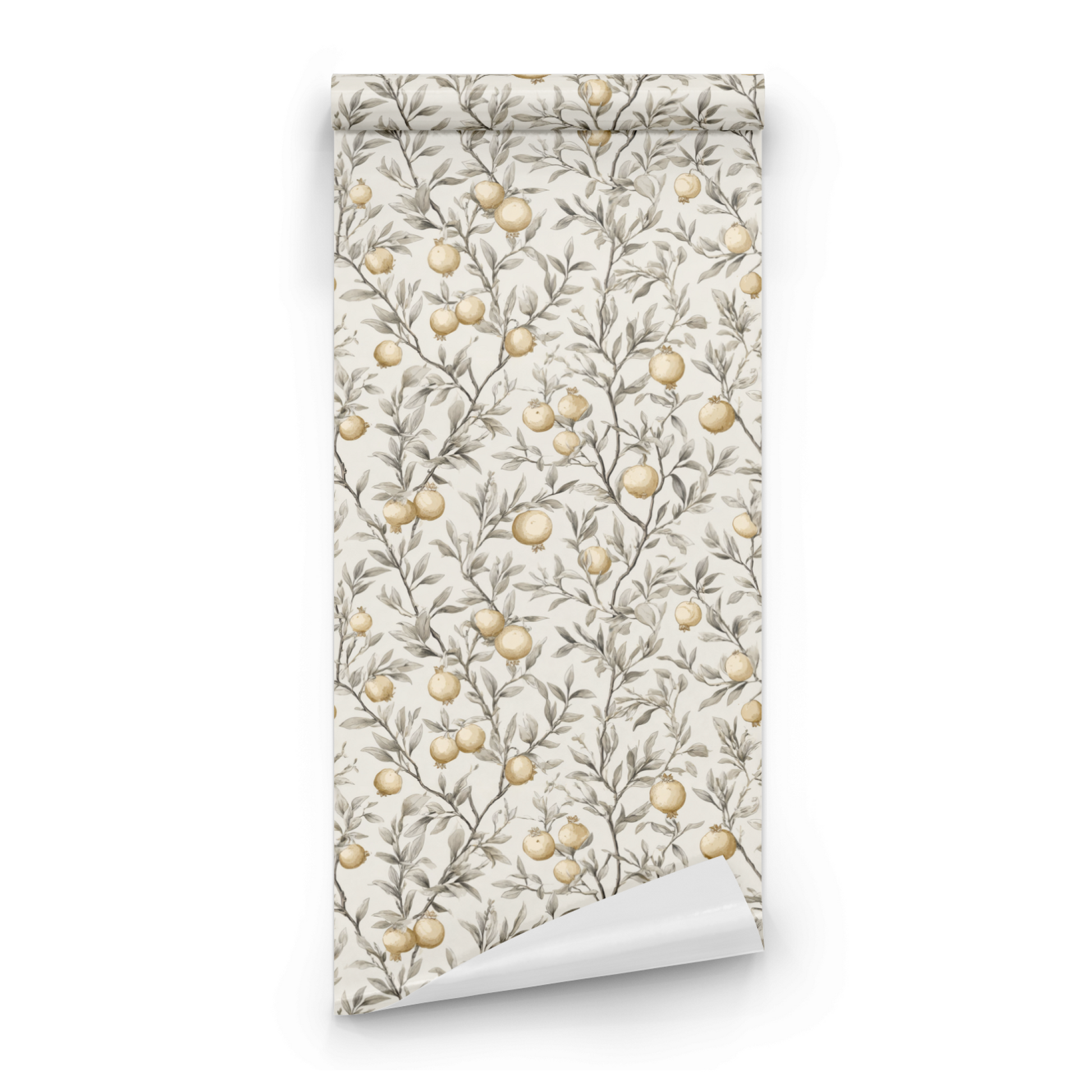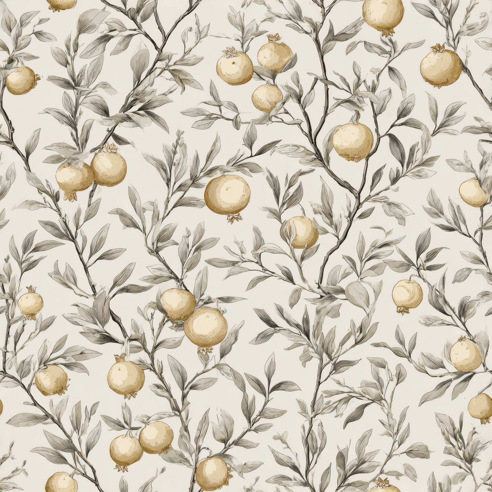 This exquisite wallpaper features a delicate arrangement of pomegranate fruits intertwined with lush, verdant leaves, creating a harmonious balance between nature and elegance. The soft, muted background enhances the golden hues of the pomegranates, evoking a sense of tranquility and sophistication suitable for any refined space.