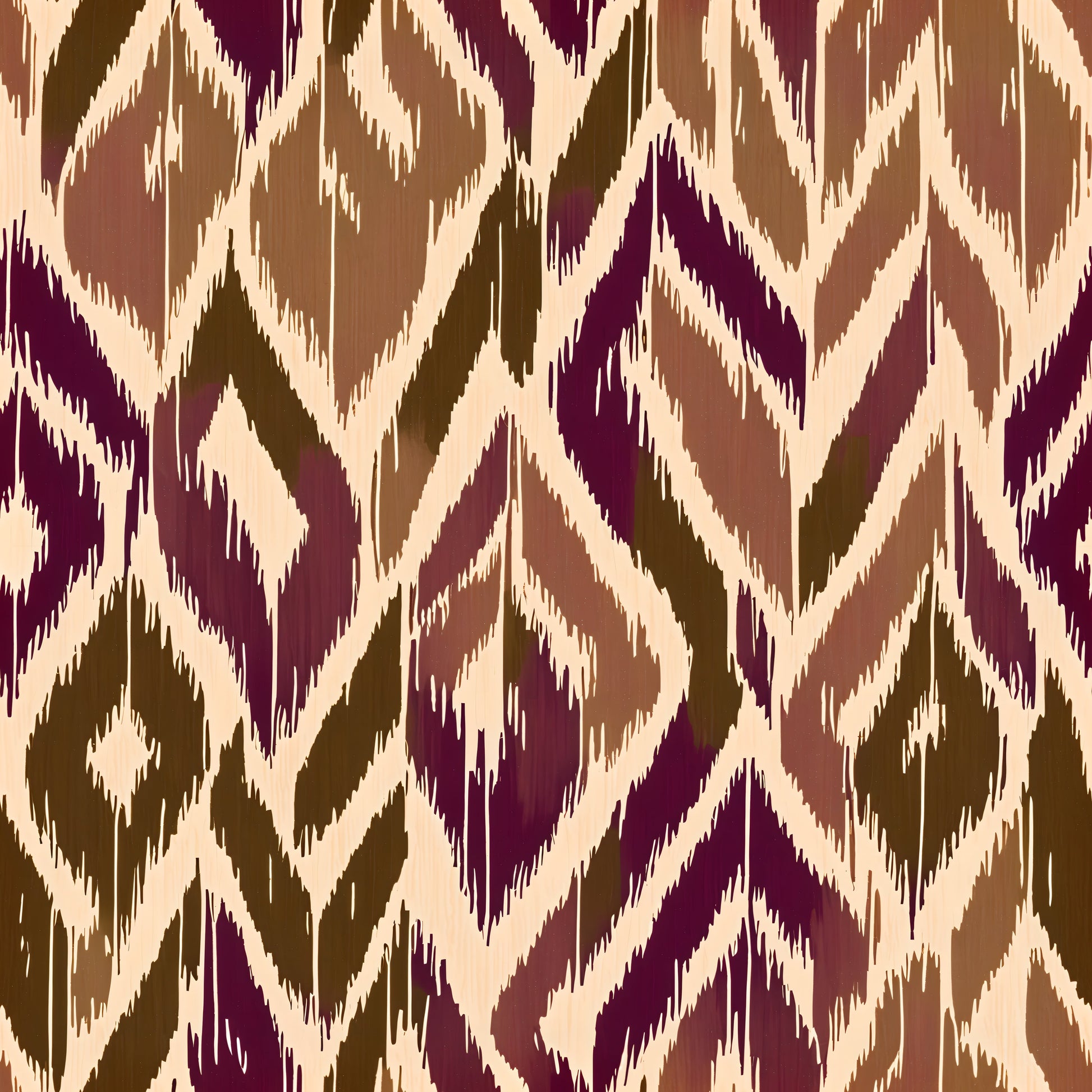 The Ikat Burgundy Retro Wallpaper offers a sophisticated blend of traditional design and modern flair with its striking geometric motif. The prominent diamonds and chevrons create an eye-catching pattern, accentuating a rich burgundy color family, perfect for evoking a mid-century modern style balanced with a timeless elegance.