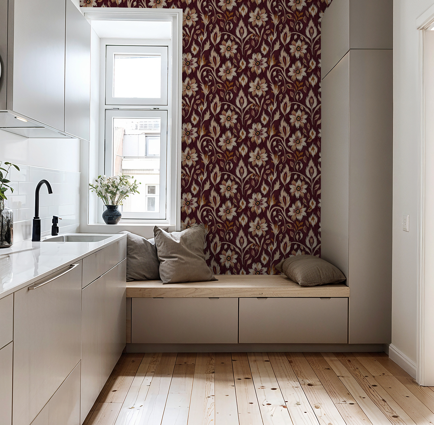 The Kaleidoscope Crimson Wallpaper is an exquisite display of elegance and timeless beauty. Featuring a dominant floral motif with intricate geometric patterns, it embraces a rich crimson color family that resonates with classic sophistication. The design evokes a vintage yet versatile style, reminiscent of an era where detailed craftsmanship was paramount.