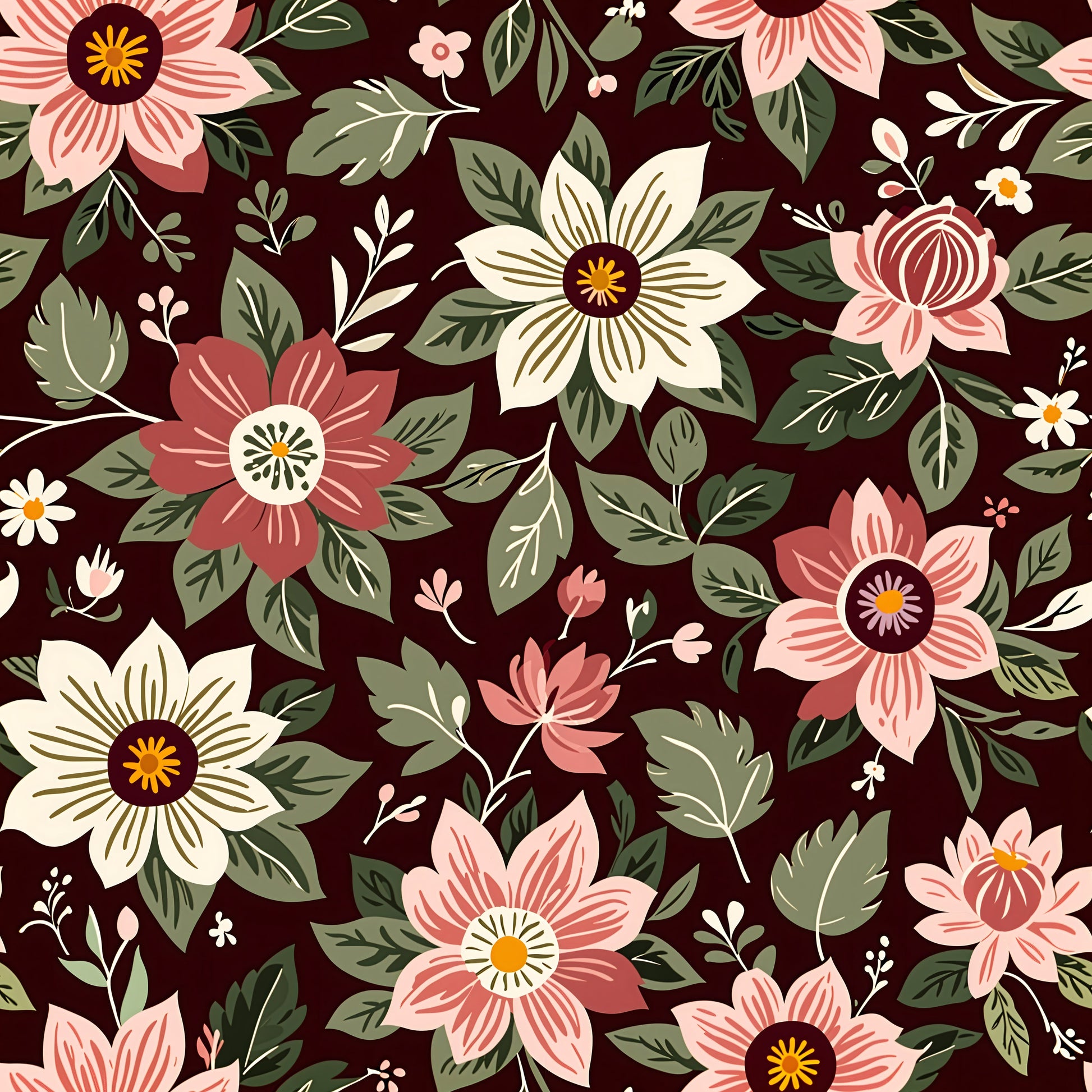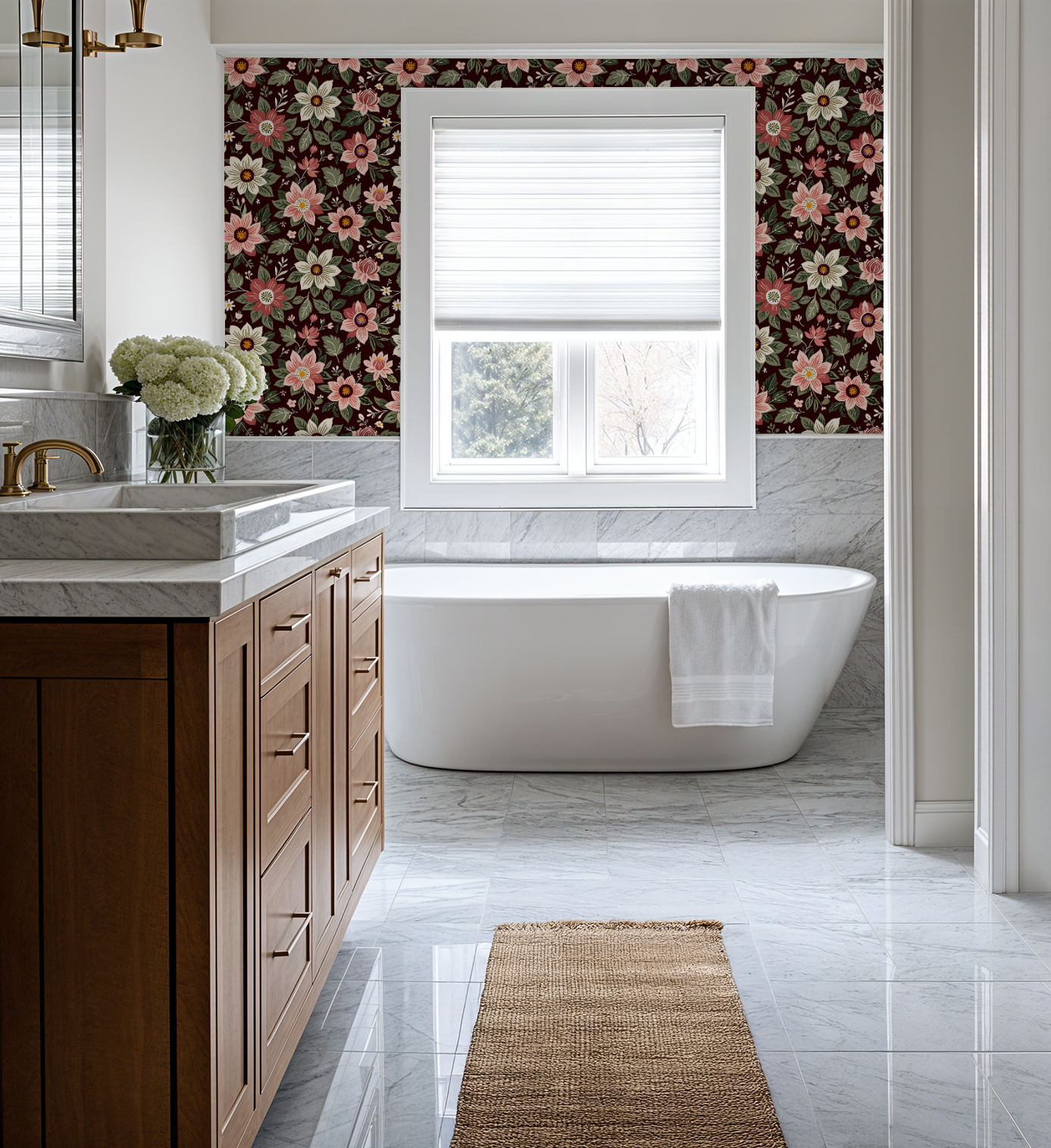 The Monochrome Blossoms Retro Wallpaper brings a nostalgic charm to any space, featuring a dominant motif of large, intricate floral designs. The primary color family includes soft pinks and creams contrasted against a deep, rich burgundy background, evoking an elegant mid-century aesthetic.
