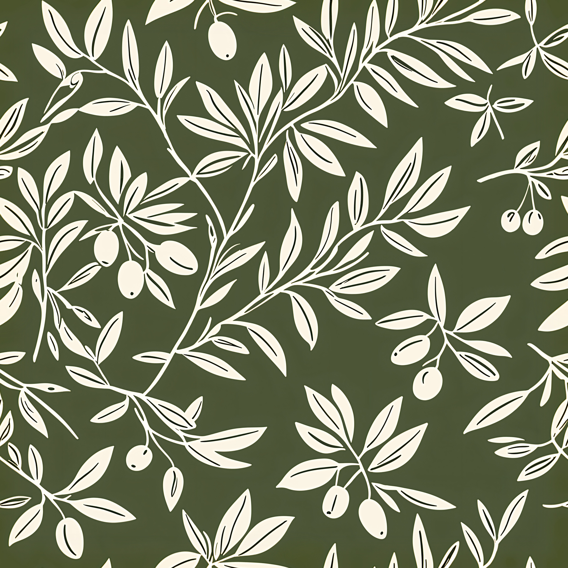 Introducing the Olive Grove Retro Wallpaper, a captivating design featuring elegant olive branch motifs that bring a sense of nature indoors. The dominant geometry of flowing branches and leaves in a soothing green hue transports you back to a retro era filled with vintage charm. This wallpaper's primary color family is an earthy olive green, exuding a rustic yet refined style reminiscent of mid-century aesthetics.