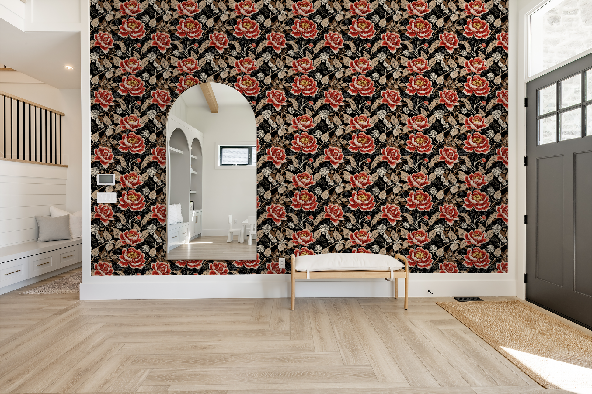 Peony Noir Retro Wallpaper elegantly captures vintage charm with its bold floral motif featuring large, graceful peonies. The dominant color palette includes deep blacks, vibrant reds, and soft beiges, channeling a classic and sophisticated retro era with a modern twist. The intricate design suggests an Art Nouveau influence, making it a stylish choice for those looking to infuse a touch of nostalgia into their space.