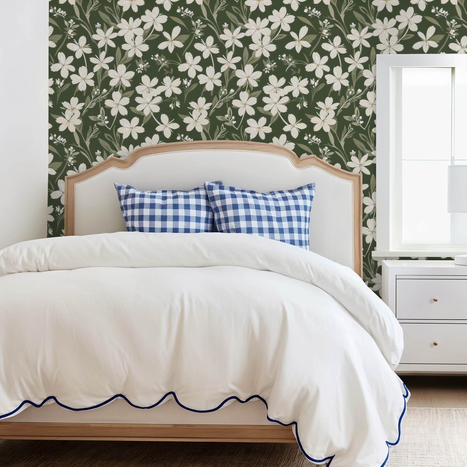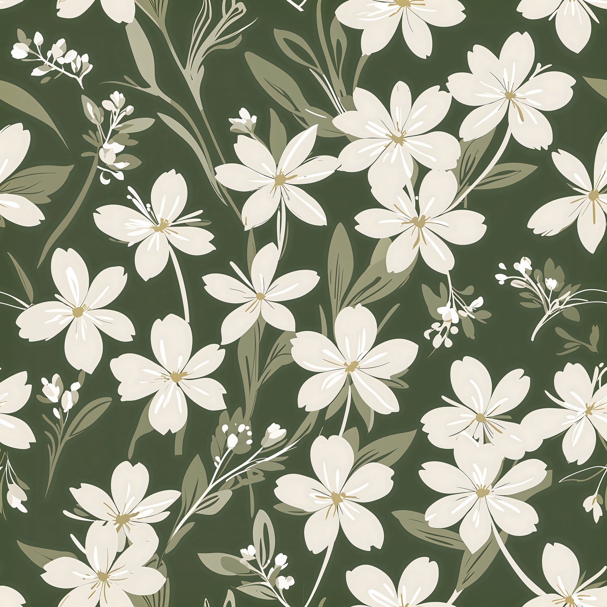 Introducing the Retro Monochrome Bloom Wallpaper, a captivating design featuring a lush floral motif with cream-colored flowers elegantly spread across an olive green backdrop. This design perfectly captures a vintage-inspired aesthetic, evoking the charm of mid-century decor with its simple yet sophisticated monochrome palette and natural patterns.