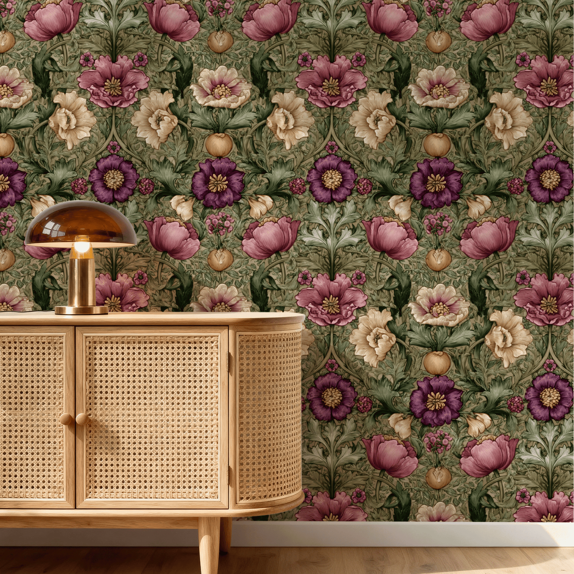 Featuring a lush arrangement of intricately detailed flowers in rich hues of burgundy, gold, and deep violet, this wallpaper exudes a luxurious garden vibe. The elegant foliage intertwined with vivid blossoms offers a timeless aesthetic, perfect for creating a statement in any room.