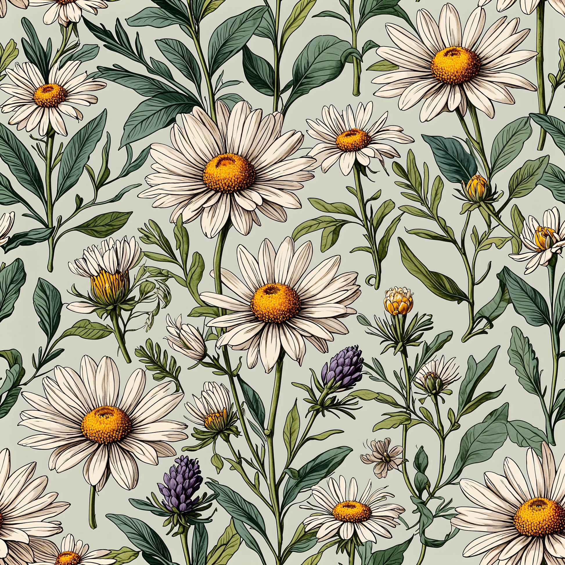 The Rustic Brushstroke Ikat Wallpaper exudes a charming, vintage feel with its elegant floral motif featuring oversized daisies and lush green foliage. This design is set against a soft, muted backdrop, primarily showcasing a color palette of greens, creams, and subtle earth tones, evoking a serene, natural ambiance reminiscent of a classic cottage garden.