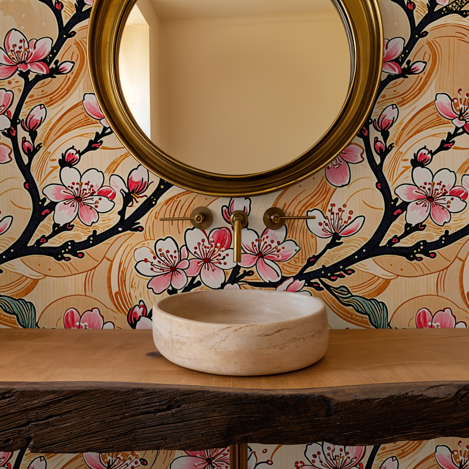 Ideal for living rooms, bedrooms, or dining spaces, the Sakura Wave Cream Wallpaper perfectly complements both modern and vintage furnishings. Pair it with minimalist decor to highlight its exquisite design or with wooden accents for a harmonious fusion of textures. Its versatility and elegance create a calming yet luxurious ambience, elevating any space while offering a timeless aesthetic appeal.