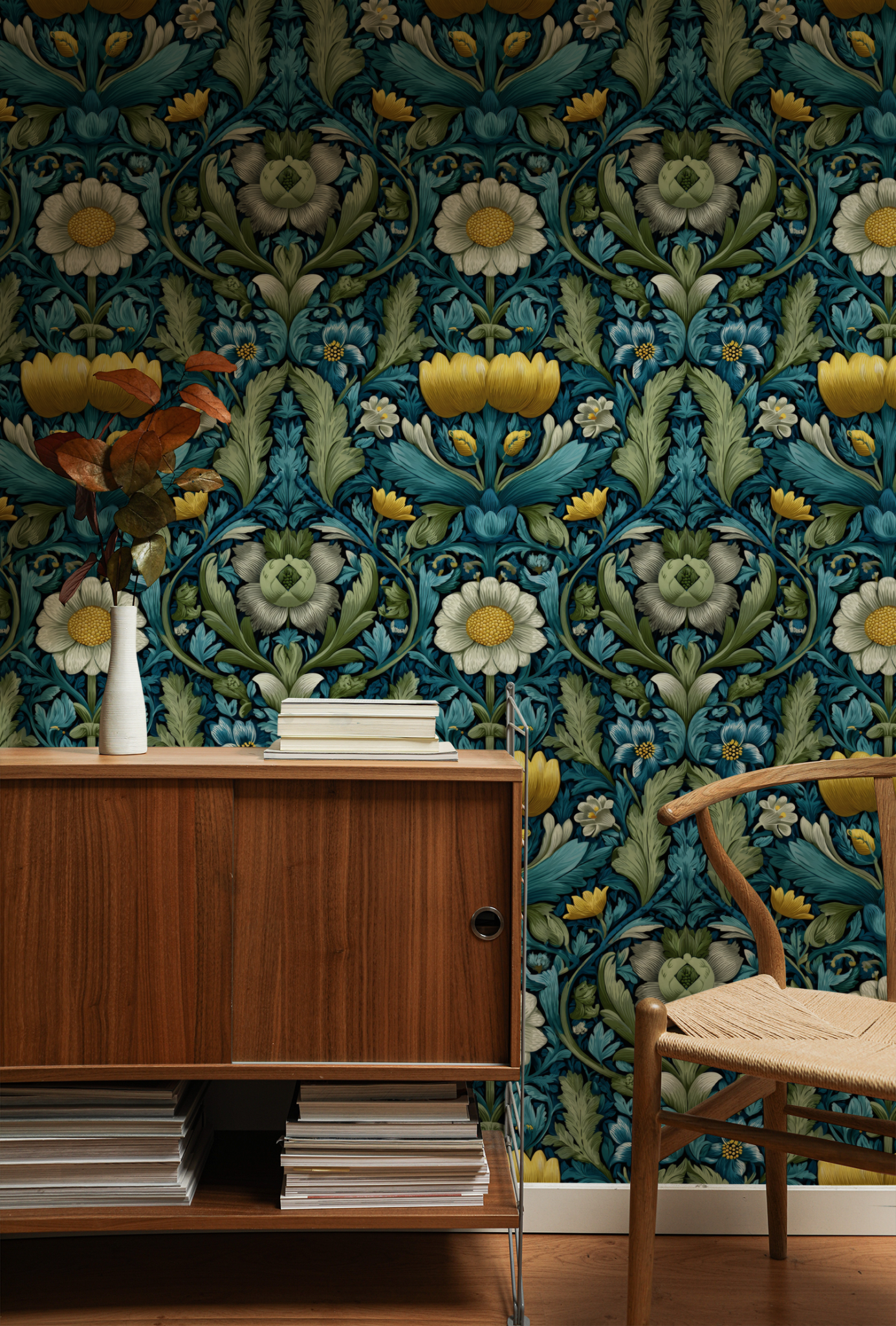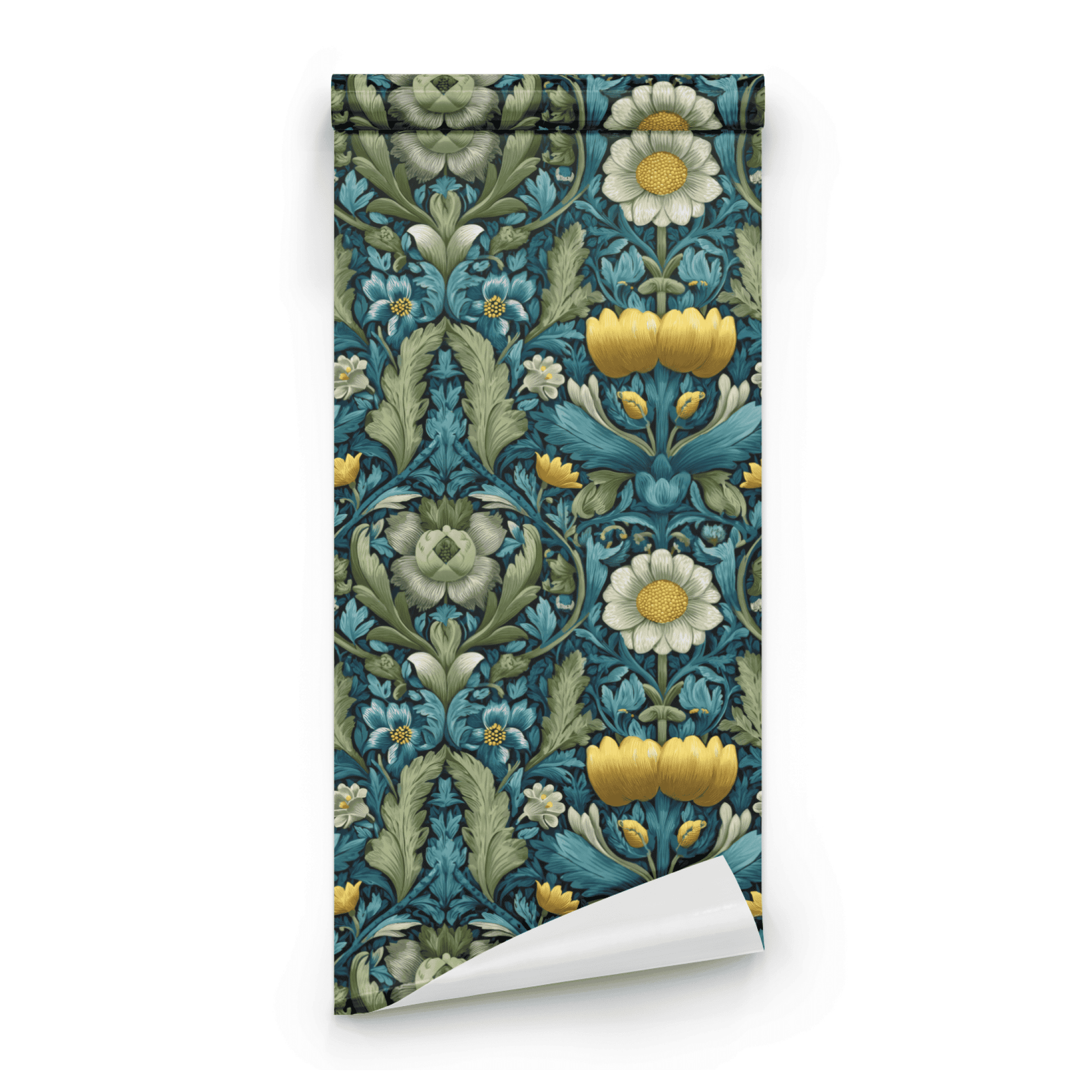 This wallpaper features a rich tapestry of intricate floral designs, showcasing a vibrant interplay of teal, golden yellow, and soft white hues. The lush foliage and diverse blooms create a harmonious garden scene that evokes a sense of elegance and natural beauty, making it a perfect addition to any sophisticated space.
