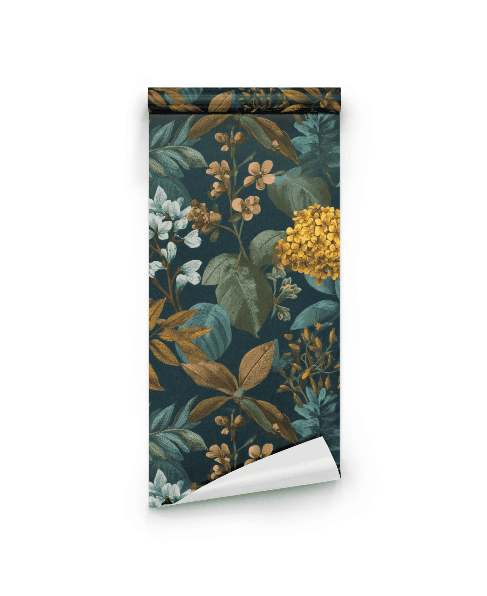 Immerse in the lush and vibrant design of Verdant Bloom Wallpaper, where deep greens and rich golds create a serene garden escape.