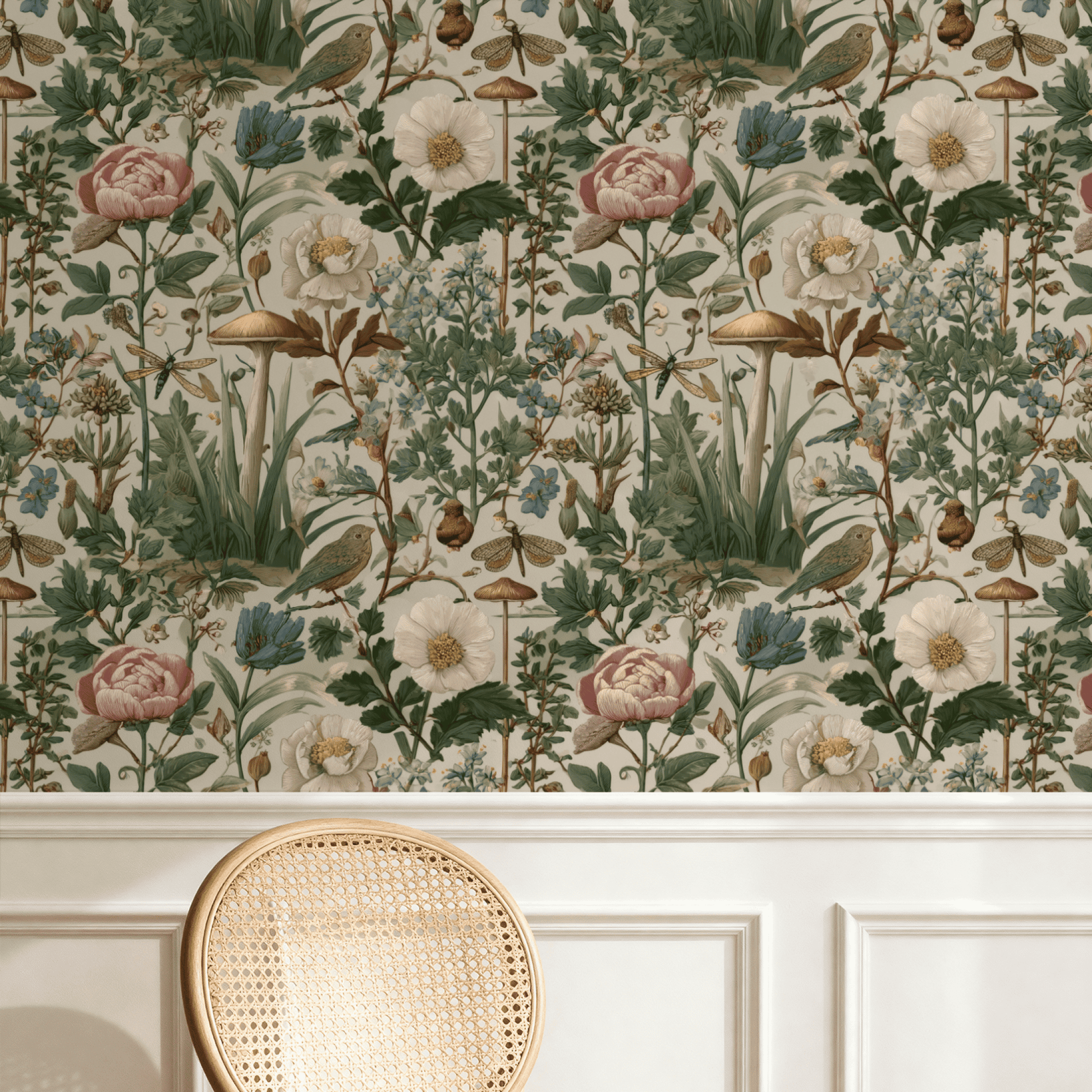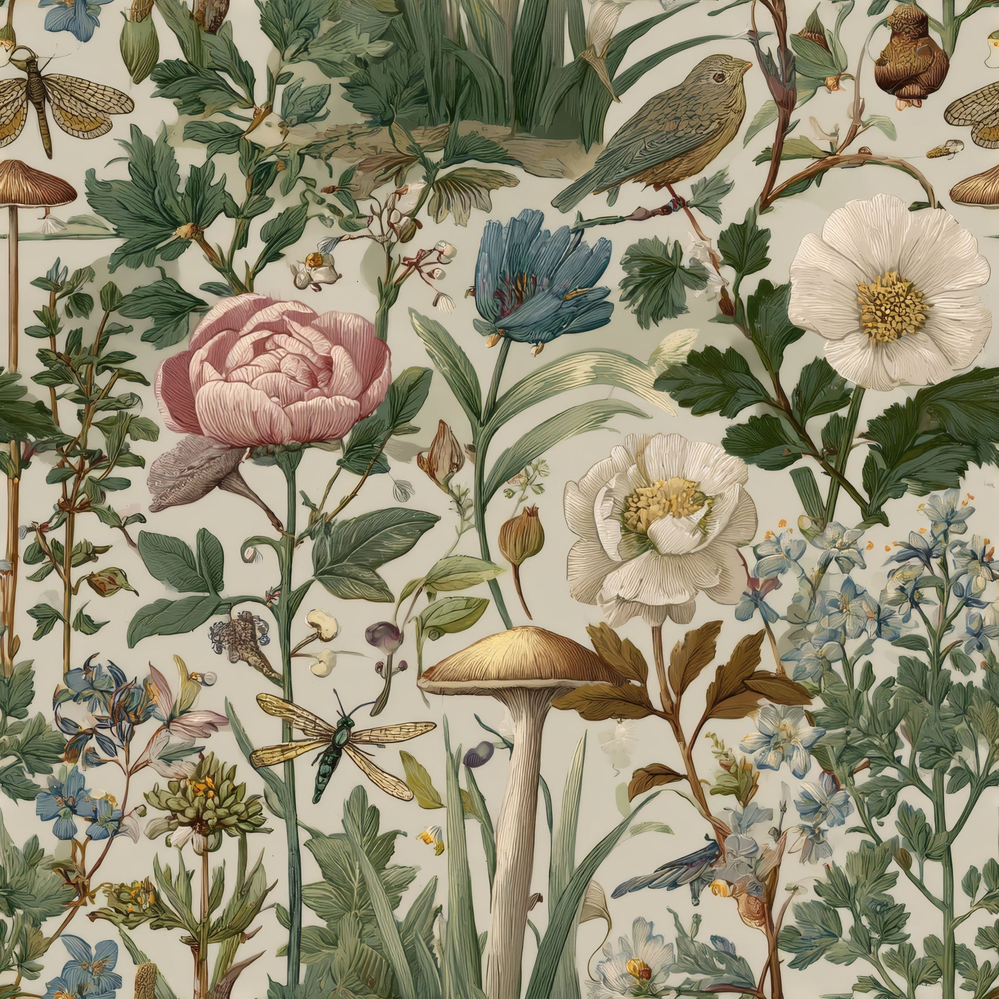 This enchanting wallpaper features a vibrant array of flora and fauna, showcasing delicate blossoms, lush greenery, and charming birds. The intricate details and soft, earthy tones create a harmonious garden scene that evokes a sense of tranquility and natural beauty, perfect for bringing the outdoors inside.