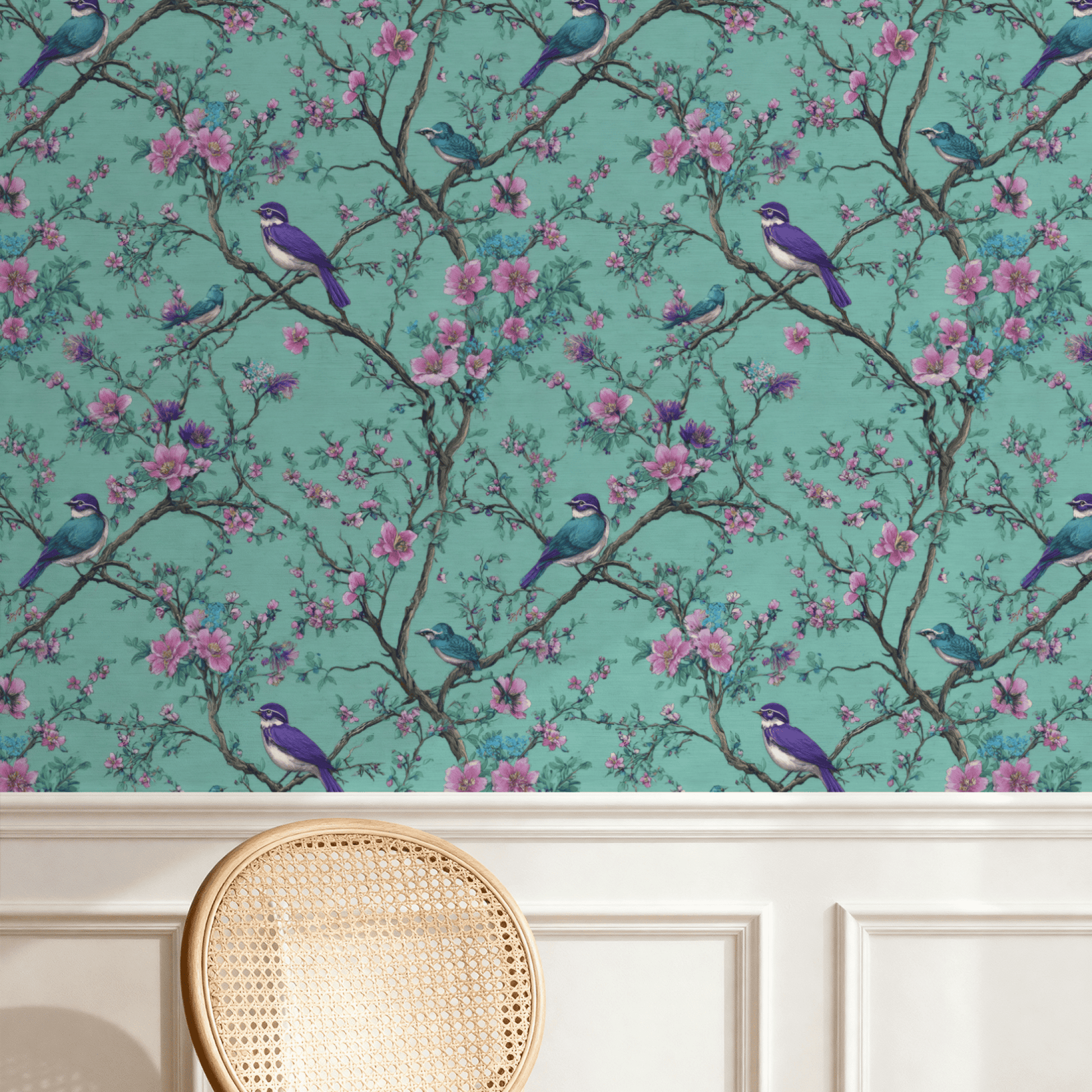 This enchanting wallpaper presents a vibrant turquoise background adorned with intricate branches bursting with blossoms and delicate birds perched gracefully. The vivid colors and whimsical patterns evoke a serene yet lively atmosphere, making it a perfect addition to any space seeking a touch of nature's beauty.