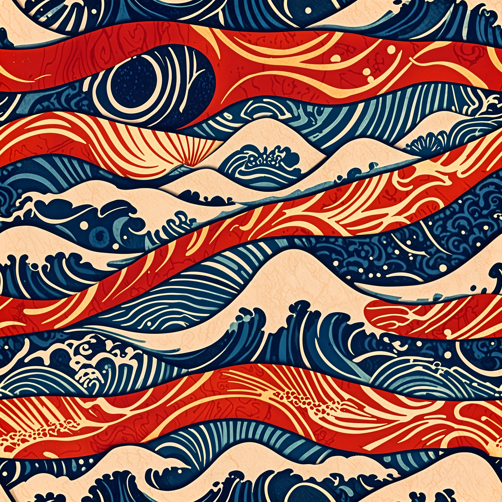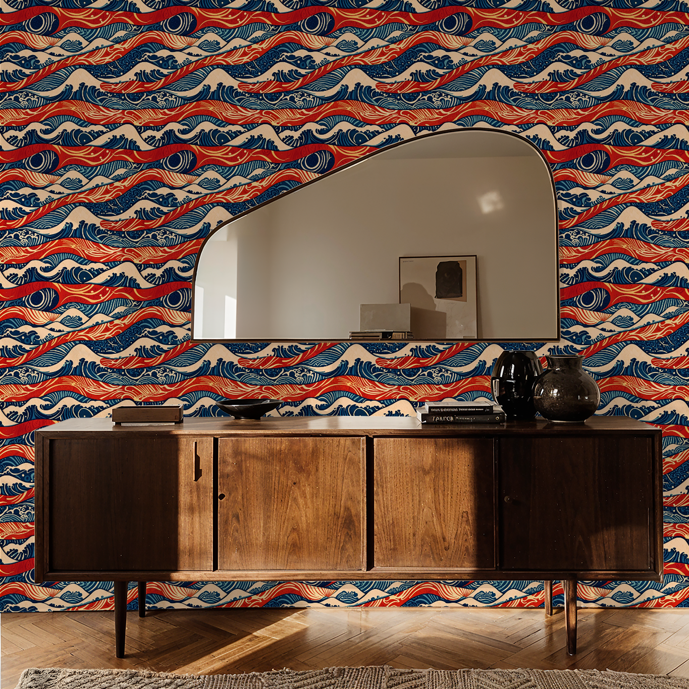 The Wave Indigo Retro Wallpaper brings a captivating blend of elegance and nostalgia to any space. Featuring a bold motif reminiscent of rolling ocean waves, the design showcases a dominant indigo hue interspersed with vibrant accents of red and cream. This striking color palette infuses the room with a sense of movement and dynamism while drawing inspiration from mid-century styles and traditional Japanese art forms.