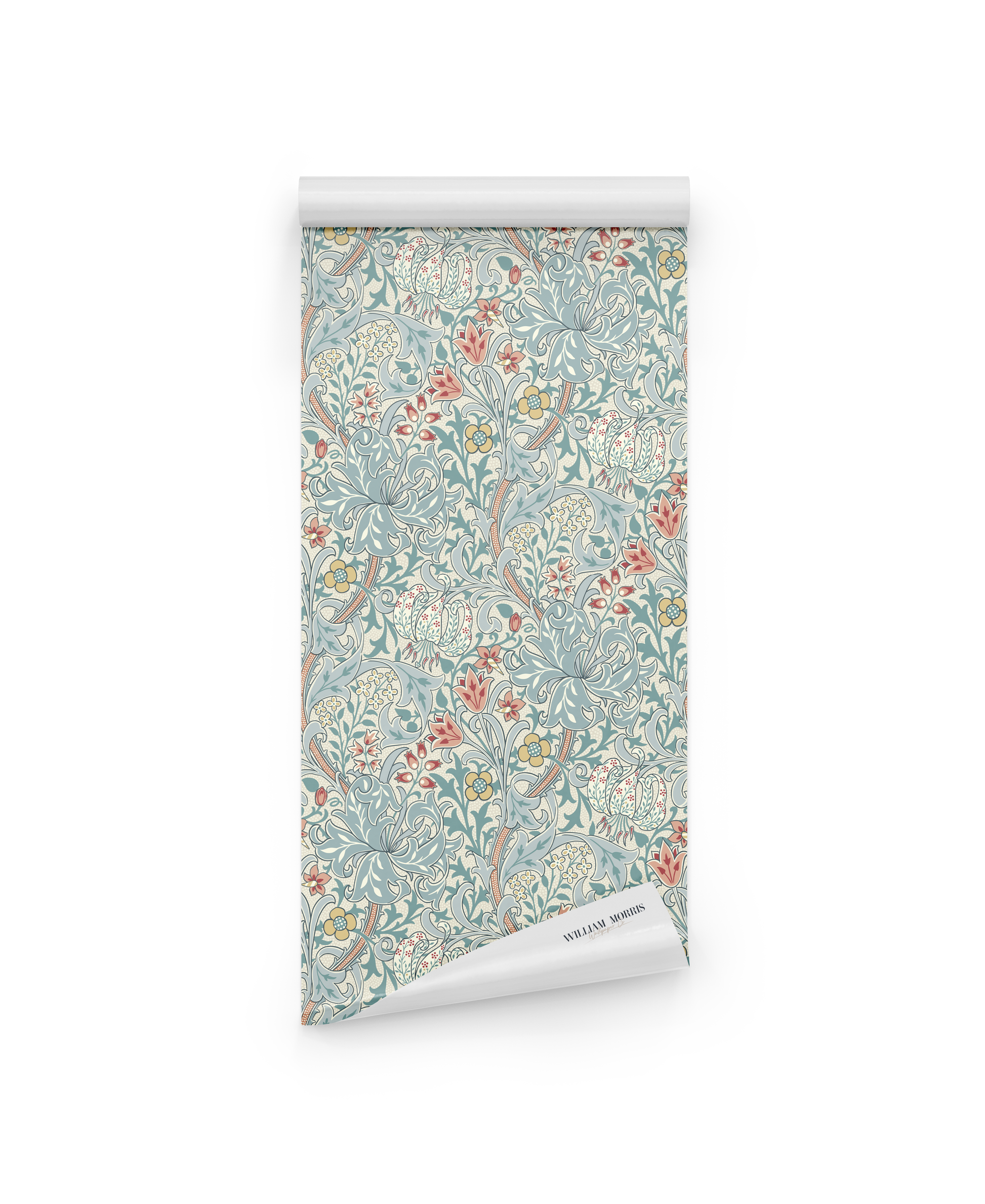 The William Morris Golden Lily Morning Light wallpaper features a lush, intricate floral motif characterized by flowing tendrils and blooming lilies. Its primary color family is a soft and inviting pastel palette, predominantly consisting of gentle blues, greens, and hints of rose and yellow, reflecting the aesthetic of the Arts and Crafts movement that Morris was renowned for.