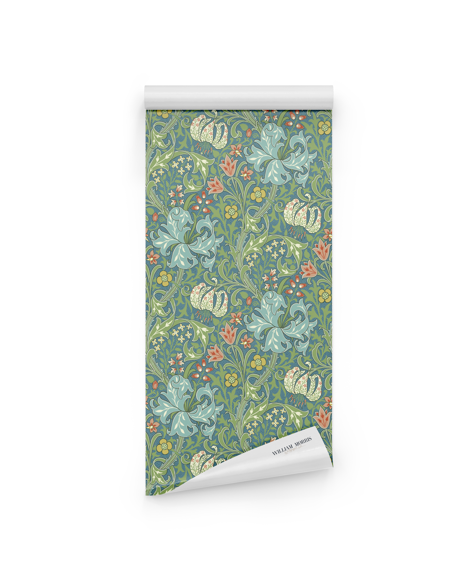 The William Morris Golden Lily Verdant Sky wallpaper features a lush floral motif with an intricate, repeating pattern of blooming lilies and swirling vines. The primary color family is a cool, harmonious blend of verdant greens and soft blues, evoking the refined elegance of the Arts and Crafts Movement.