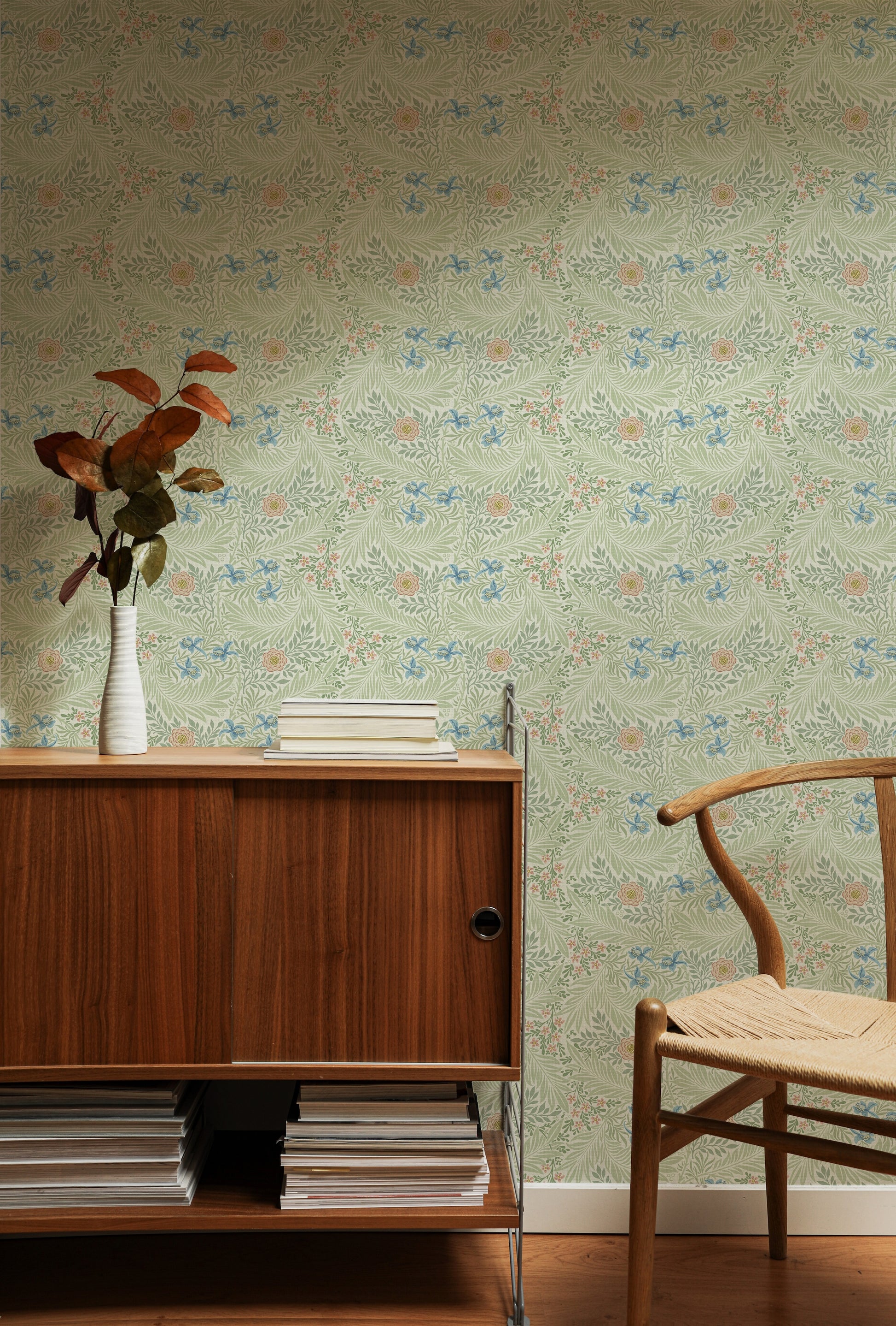 The William Morris Larkspur Garden Breeze wallpaper is a captivating design featuring a repeating floral motif with intricate details. The dominant geometry consists of swirling vines and blossoms, primarily in soft green hues, accentuated by subtle touches of blue and coral. This design exudes a classic and timeless aesthetic reminiscent of the Arts and Crafts movement, enhancing its visual appeal.
