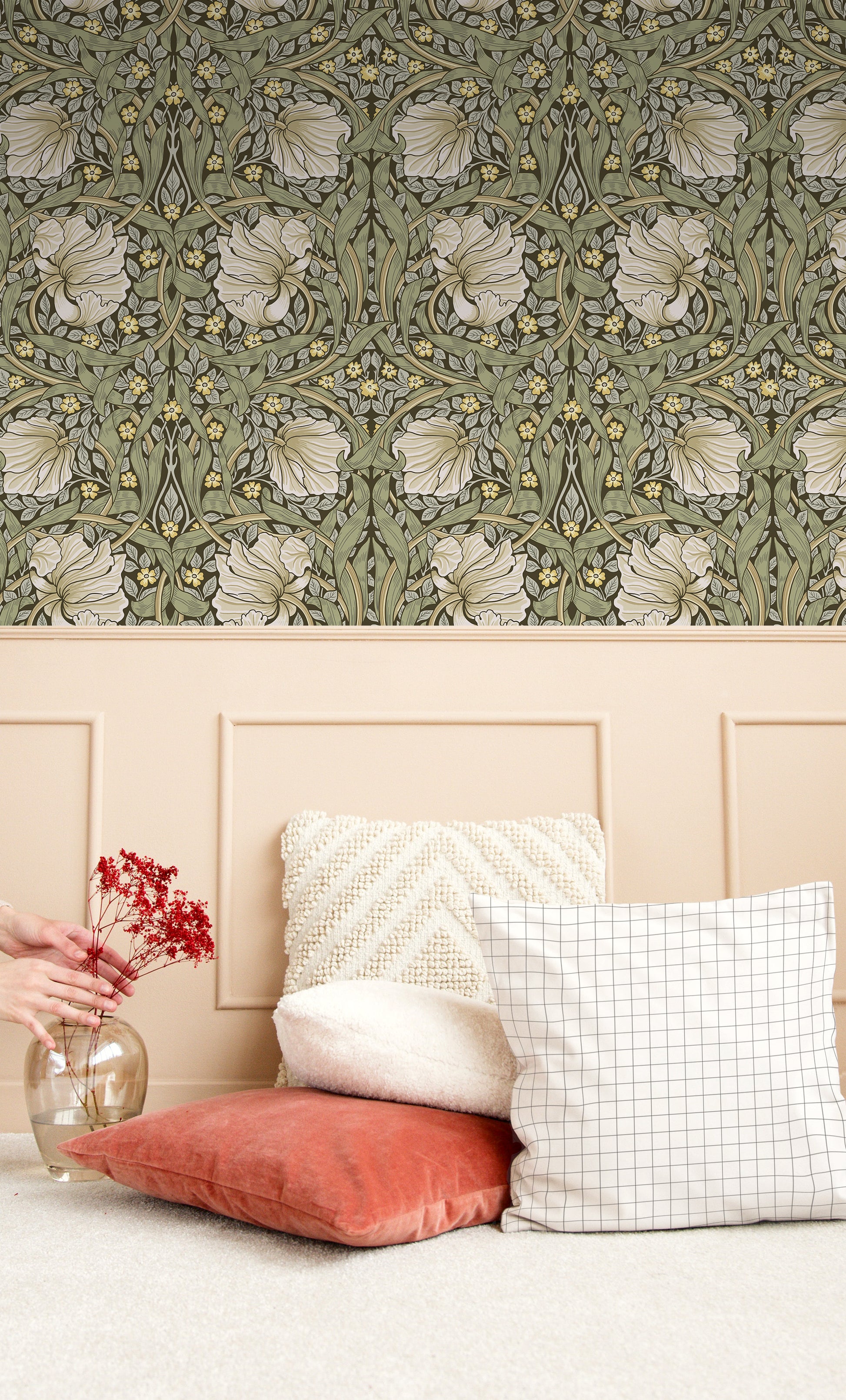 William Morris Pimpernel Olive Verdant Whisper is a breathtaking wallpaper that seamlessly combines intricate floral motifs with a sense of symmetry and organic elegance. The dominant geometry is a rich tapestry of intertwining blossoms and foliage, primarily set in a harmonious olive green palette. This piece strongly echoes the Arts and Crafts revival with its intricate detail and timeless design, reminiscent of the late 19th century.